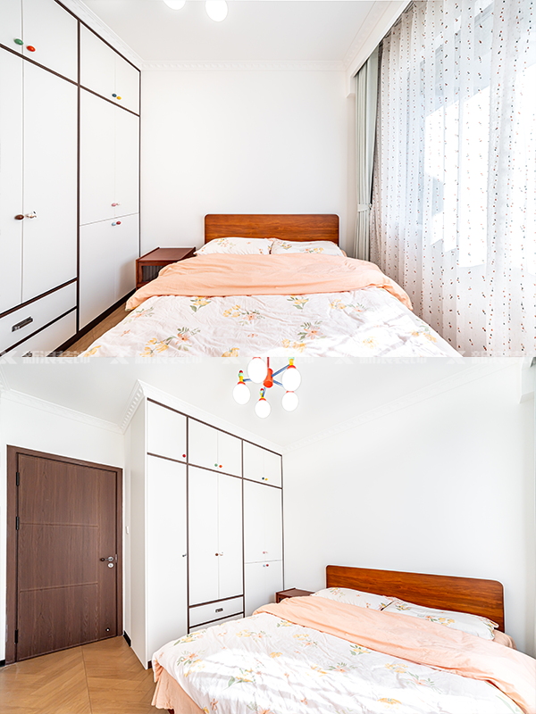 ?? 地面木紋磚通鋪,部分墻面做半墻木飾面造型,顏色過度自然,空間不壓抑。