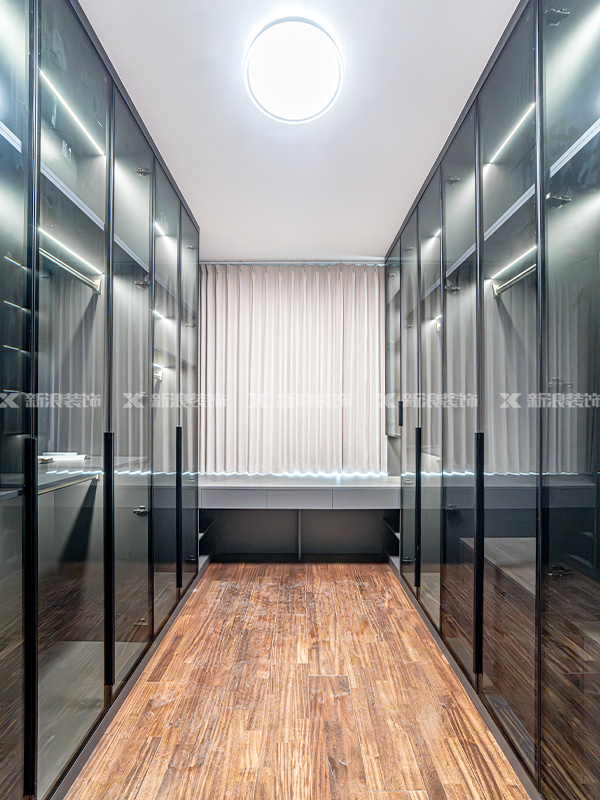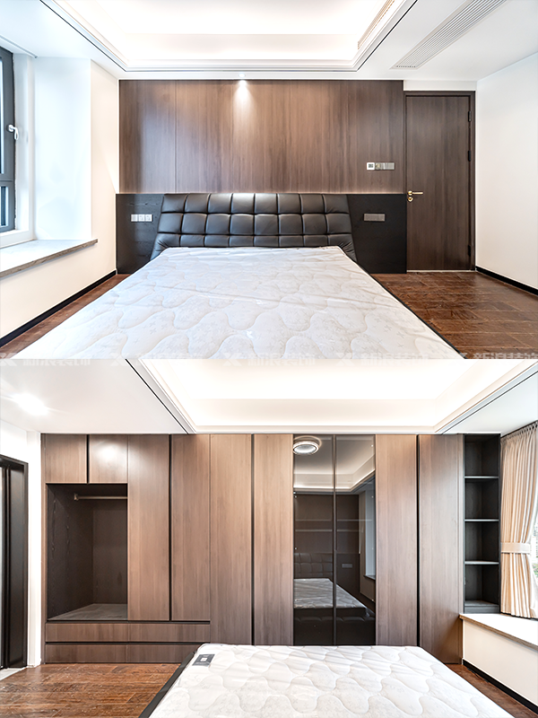 主臥擯棄轉(zhuǎn)交衣帽間,采取床尾柜更加大氣,背景墻也有增加氛圍感、整體感的作用。衣帽間的鍍膜玻璃,也可以讓我們避免鏡子小的尷尬處境!